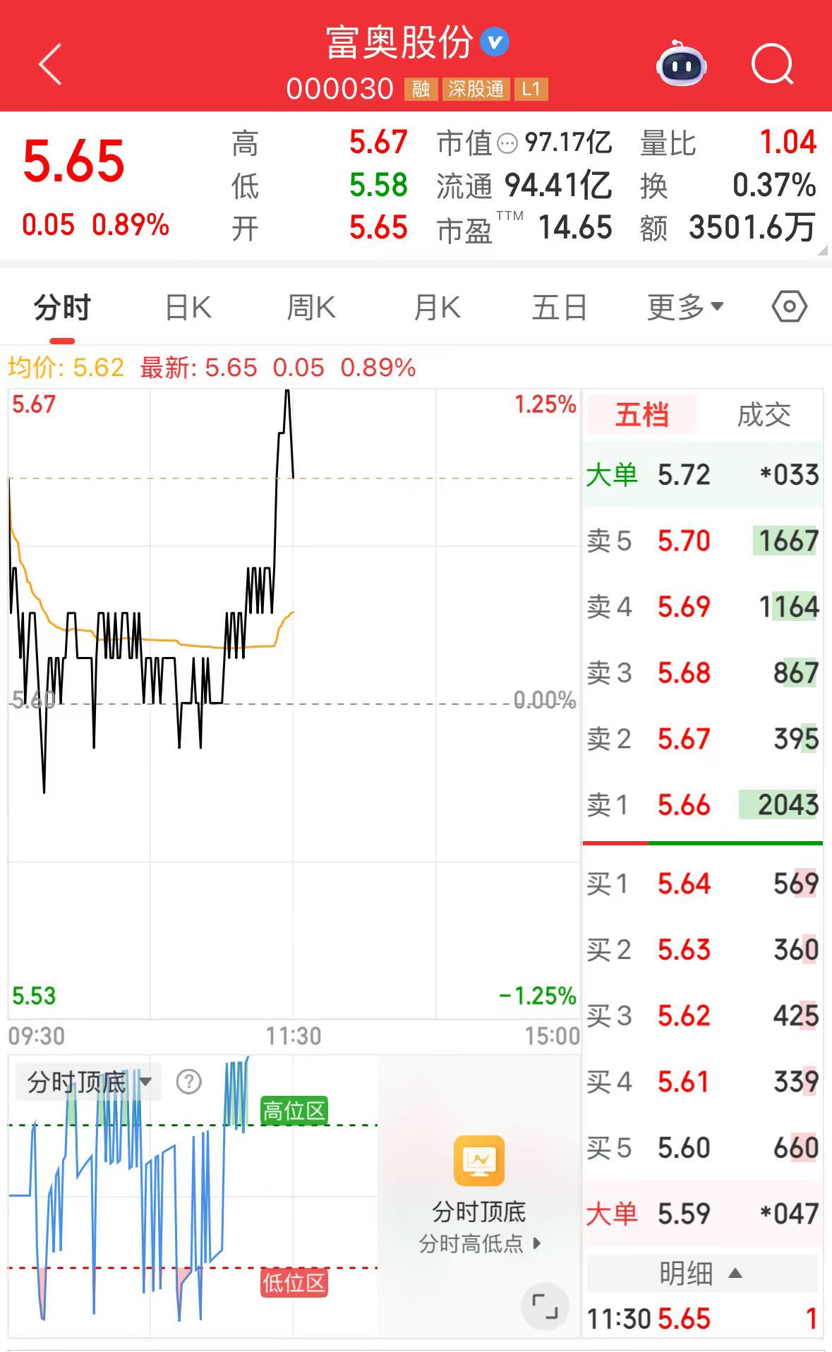 截至9月30日午间收盘,富奥股份涨0.89%,报5.65元/股。