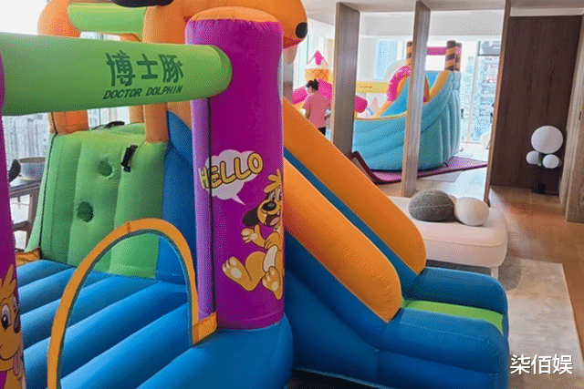 郭碧婷还在客厅搭建了充气城堡供孩子们玩耍,真的是布置的温馨又气派。